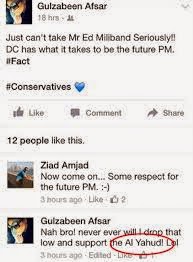 ‘Gulzabeen Afsar, a council candidate in Derby, made the comment on Facebook. In a post, she said: “Just can’t take Mr Ed Miliband seriously!” and later said “Never ever will I drop that low and support the Al Yahud!”. Al Yahud is Arabic for “the Jew”.’